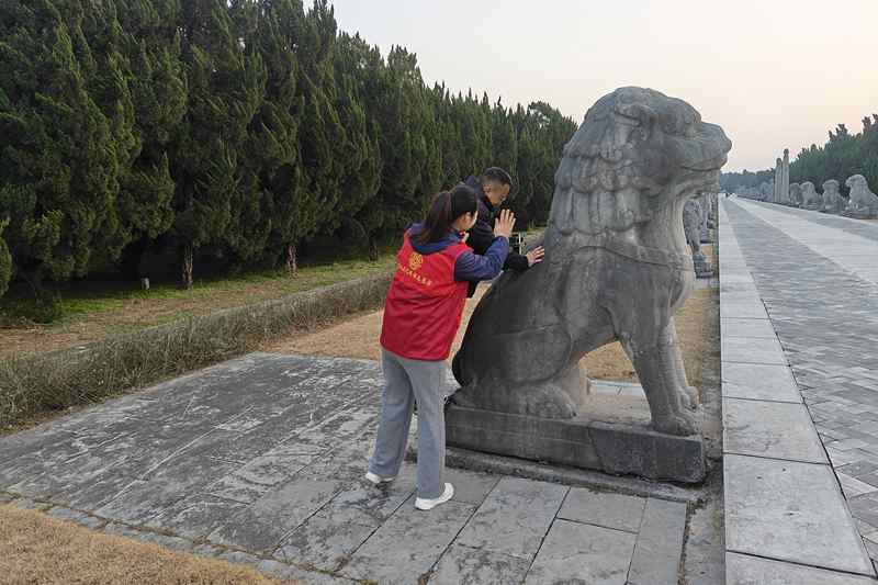 志愿服务人员正在对随意攀爬景点文物行为进行劝阻