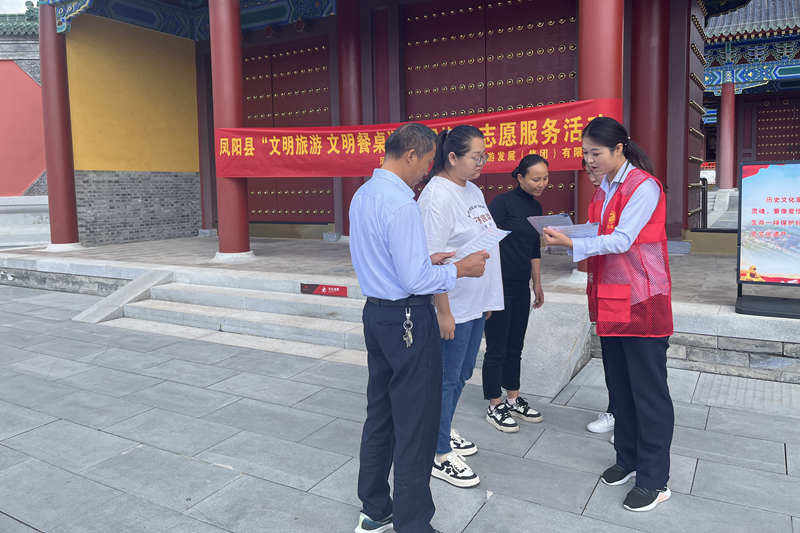 2025年4月30日文旅局志愿者在公共旅游景点开展凤阳县“文明旅游文明餐桌”文明旅游志愿服务活动,为在场游客分发宣传单,进行文明旅游文化宣传。