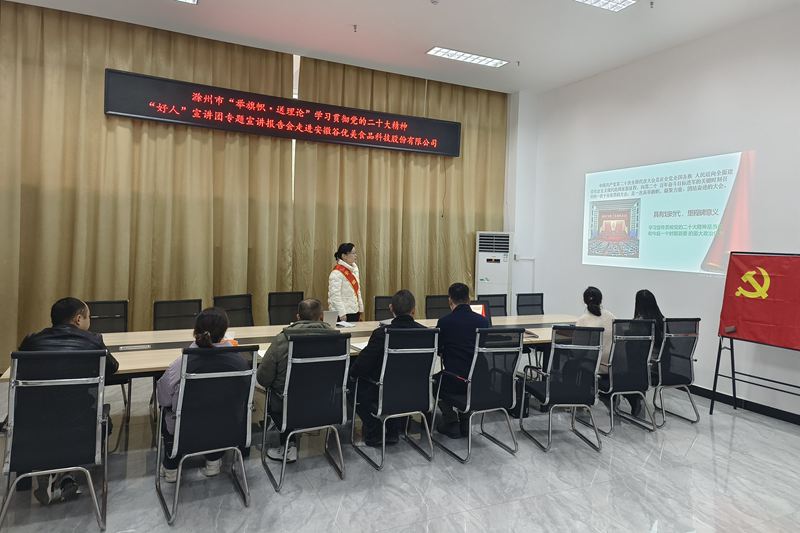11月29日,“举旗帜 送理论”学习贯彻党的二十大精神“好人”宣讲团宣讲报告会走进安徽谷优美食品科技股份有限公司。