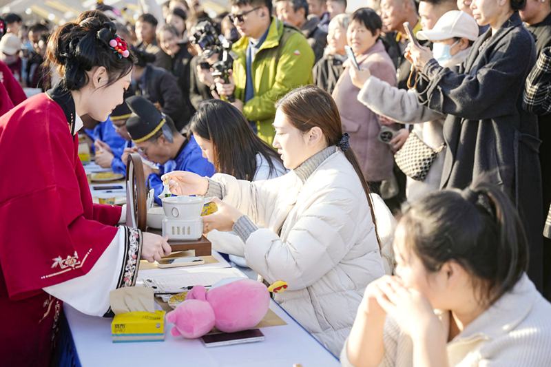在风味小吃摊前,很多市民为了过一把观凤阳烟火、品人间美味、做大明宫主的“瘾”,顾不上斯文,手里拿着几串或端着一碗,嘴里含着一块,或站着吃、或边走边吃,无论哪种吃相,无一不在昭示着“洪武宴”“凤阳味道”的诱惑。在这里都能找到舌尖上的享受,在味蕾的盛宴中感受历史的温度,在技艺的对话中触摸文化的脉络,领略“洪武宴”文化的深厚底蕴与无限魅力。