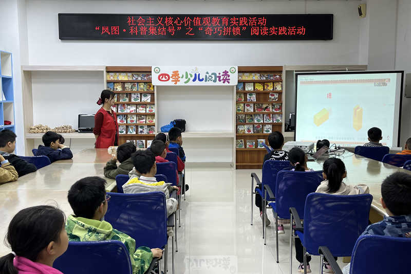 活动伊始,书香志愿者播放了孔明锁起源动画短片,让大家直观了解了仅凭构件凹凸咬合即可牢固拼插的玄机,瞬间点燃了大家的探索热情。接下来,志愿者通过多种孔明锁实物展示以及故事与影像资料讲述,展现了孔明锁在现代多个领域的创新应用。图书馆还向参与者推荐了《玩转3D打印:奇妙的古代发明》《给孩子的中国古建筑》等优秀读物,让孩子们深入了解传统工艺承载的工匠精神。