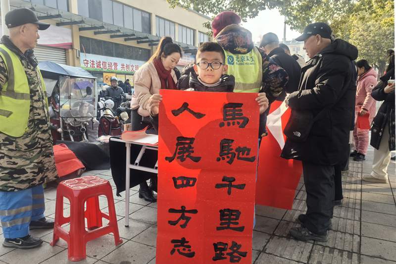 活动现场热闹温馨,社区邀请不同年龄段的书法爱好者现场挥毫泼墨,一幅幅寓意吉祥的春联与“福”字跃然纸上,承载着对新年的美好期盼。社区工作人员引导居民有序领取,拿到手写春联的居民们纷纷表示,手写春联更有“年味”,字里行间都是社区满满的心意。