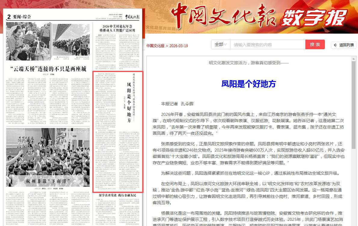 【中国文化报】凤阳是个好地方 阅读链接:https://npaper.ccmapp.cn/zh-CN/detail?Hid=69bac960aa87472d21d00a24&date=2026-03-19&page=2&title=%E2%80%8B%E5%87%A4%E9%98%B3%E6%98%AF%E4%B8%AA%E5%A5%BD%E5%9C%B0%E6%96%B9 编辑: