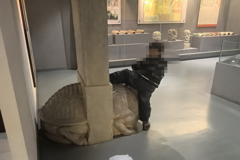 个别游客随意攀爬石质文物(即使是复制品),也容易因外力攀爬造成磨损、结构损伤。