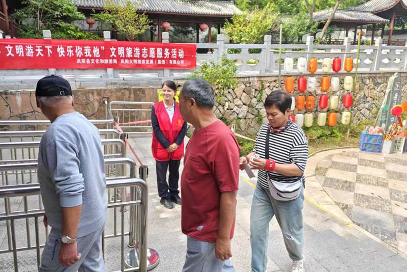 文明旅游志愿者在公共景点展开“文明游天下,快乐你我他。”文明旅游志愿服务活动
