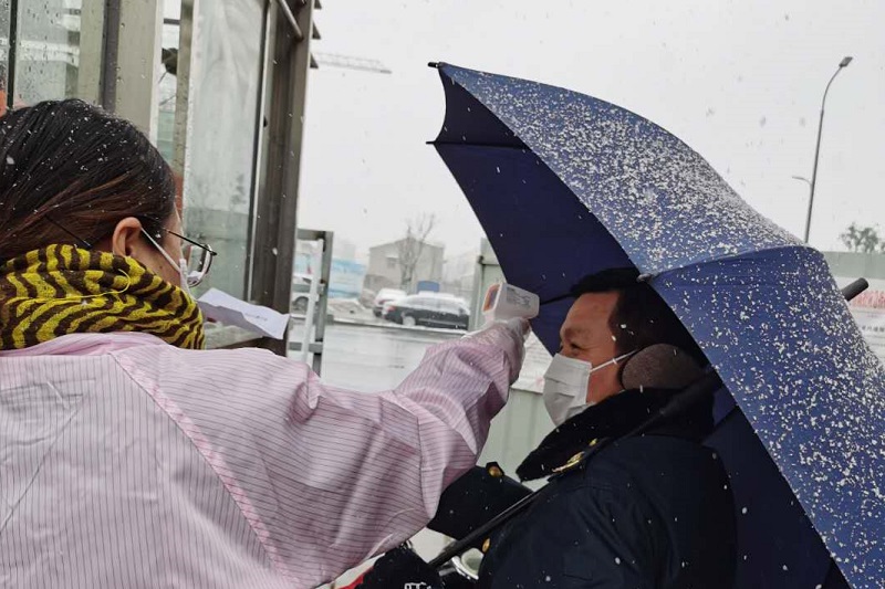 早上7时,天还蒙蒙亮,分局三位女职工刘颖、周理玉、赵维英就来到中都南苑东大门值守点,做好检查器具消毒,准备好登记簿,开始了忙碌的工作。为了阻抗疫情传播,寒风中她们严格查验进出小区人员、车辆的通行证件,并做好信息登记,耐心地劝返无正当理由外出人员,解答居民对疫情和防疫政策的疑惑。上午10时许,天空中雪花纷纷扬扬地飘落了下来,风雪并没有停住她们忙碌的脚步,“请您出示出入证明”“请您登记下信息”,她们不畏严寒、顶风冒雪坚守着岗位,全力守护着人民群众的生命安全和身体健康。